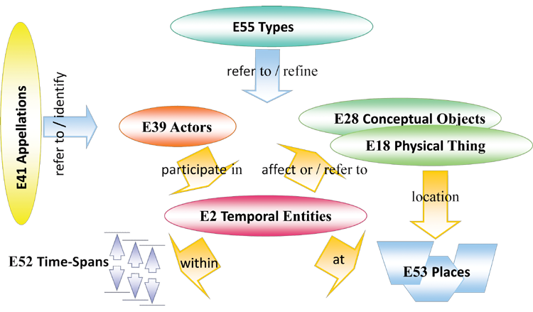 - classes which represent general notions in the domain of discourse, e.g. E55 Type, E7 Activity, E53 Place